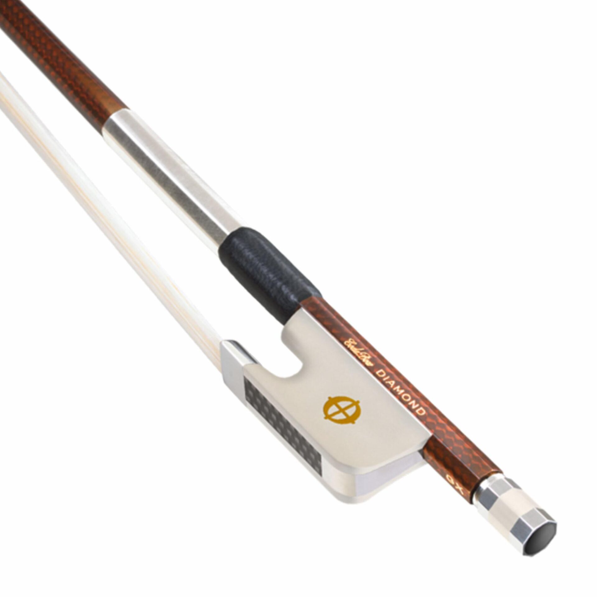 The CodaBow Diamond GX viola bow has a round carbon graphite stick with Kevlar core, a sterling-silver fully mounted Xebony or Alabaster* frog, Coda eye, three-part adjuster, silver winding and leather grip.