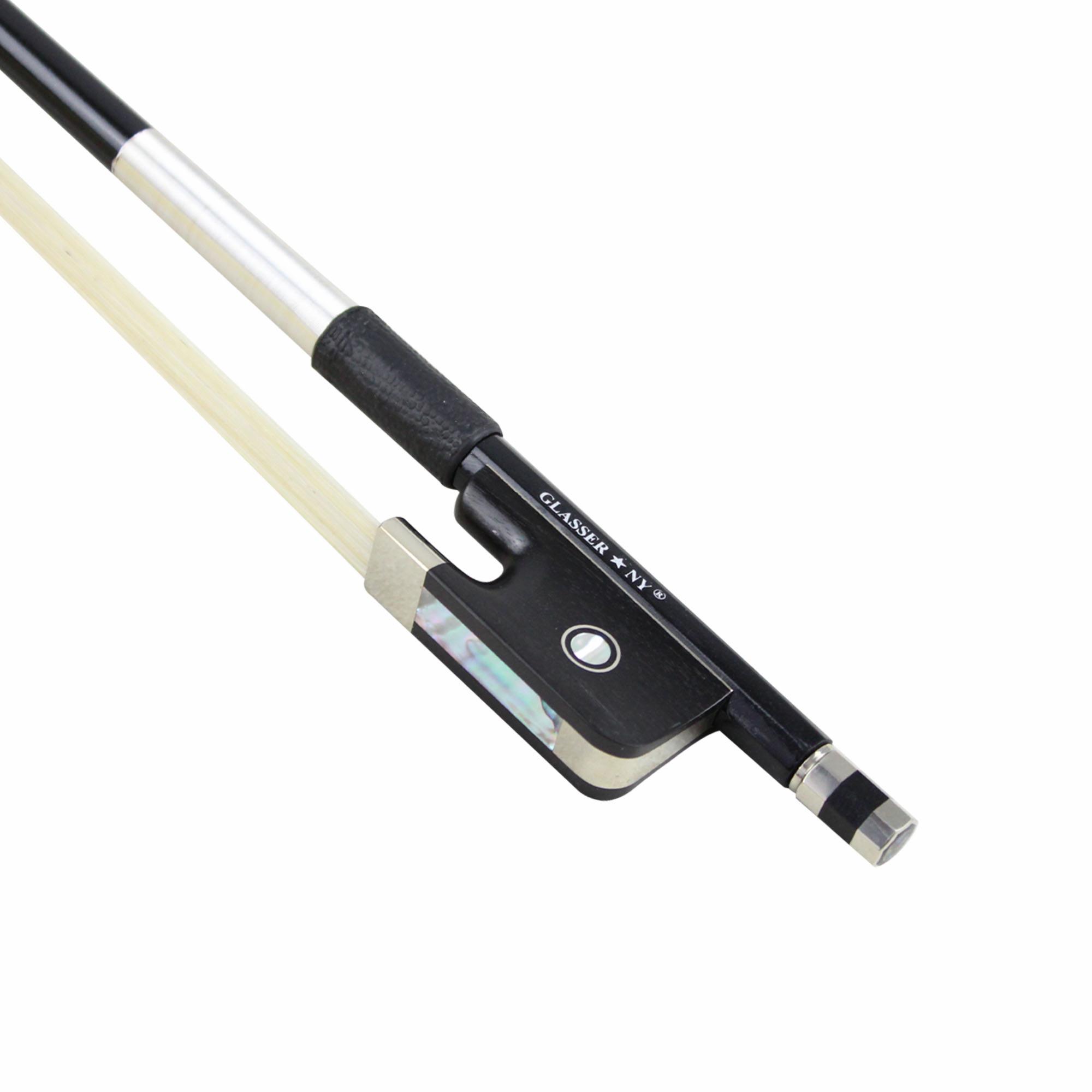 This is Glasser’s highest quality carbon graphite stick that also features a German-made ebony frog from Paulus. The nickel-silver fully mounted frog has a flamed abalone slide and double eye. Imitation lizard grip with nickel silver winding. Finish is high gloss black with premium stallion unbleached horsehair.
