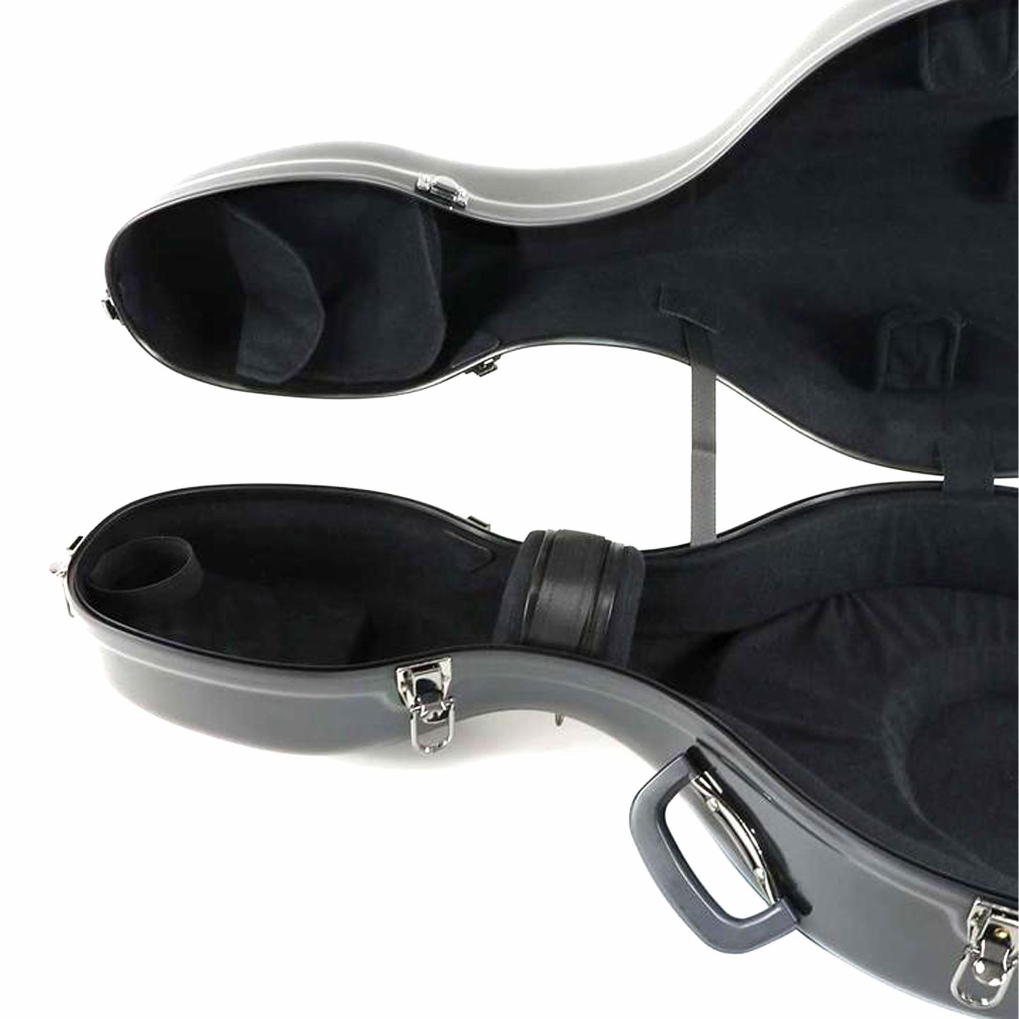 Jakob Winter J.W. Eastman cello cases are made with a reinforced synthetic fiberglass with elements of carbon to make it lighter than most fiberglass cases. When closed it seals with a weather resistant rubber flange offering further protection against moisture and climate fluctuations. The interior is made with a plush black velvet and has a soft suspension system for maximum shock protection. It also comes with a hygrometer and two bow holders. The exterior has six lockable latches, two carrying straps for a backpack option, a leather handle, and four rubber feet for stability while standing.