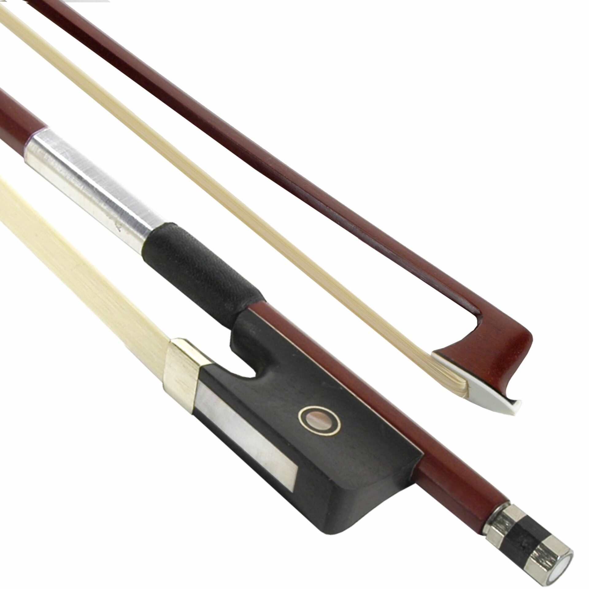 Real horsehair on an octagonal Brazilwood stick, half mounted ebony frog with shell eye, three-part adjuster, nickel-silver winding, and leather grip all serve to distinguish the Klaus Mueller viola bow from other student-level bows.
