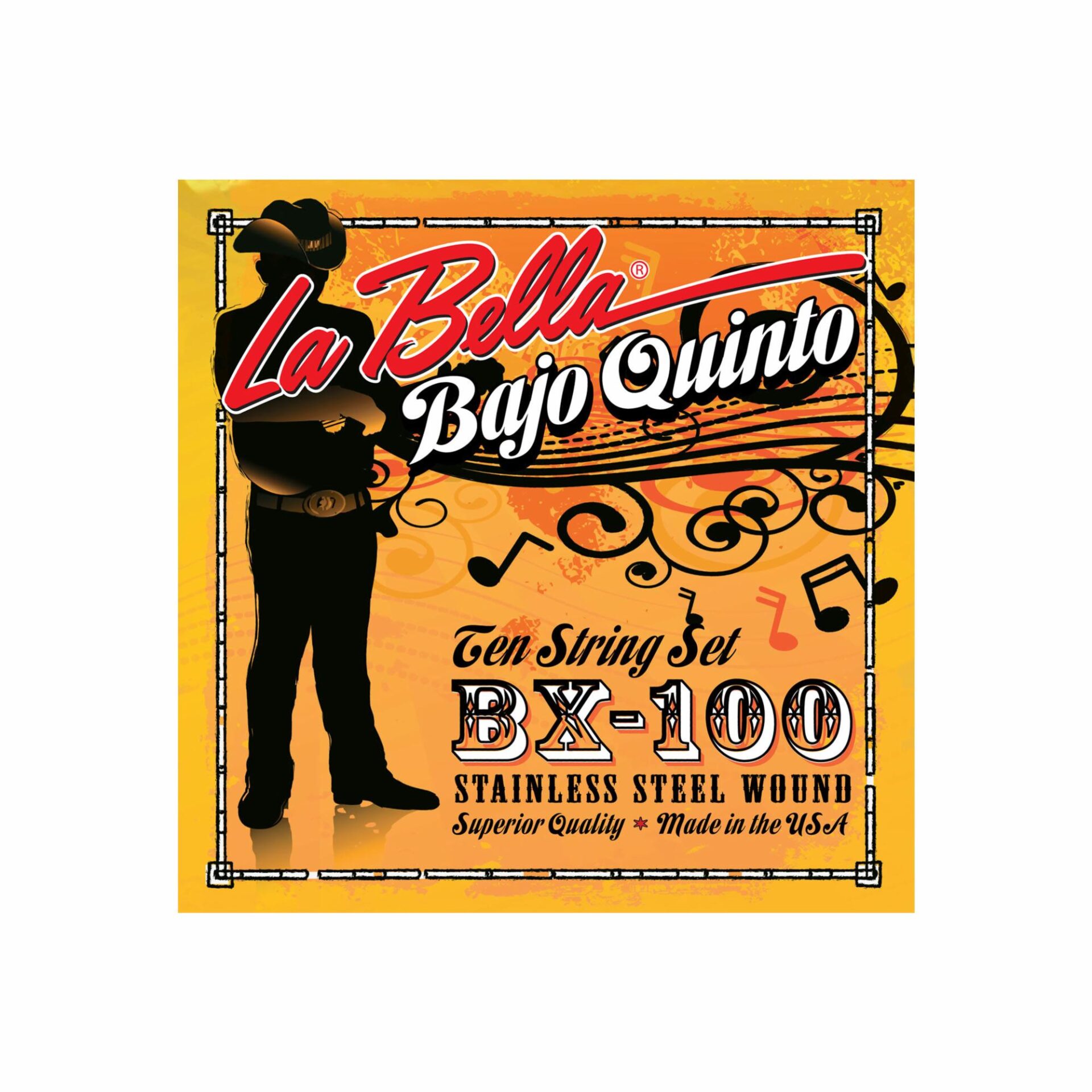 La Bella BX100 Bajo Quinto strings are stainless steel wound with loop ends, and are packaged using Modified Atmospheric Packaging. This increases shelf life, prevents tarnishing, and ensures the freshness of every pack.