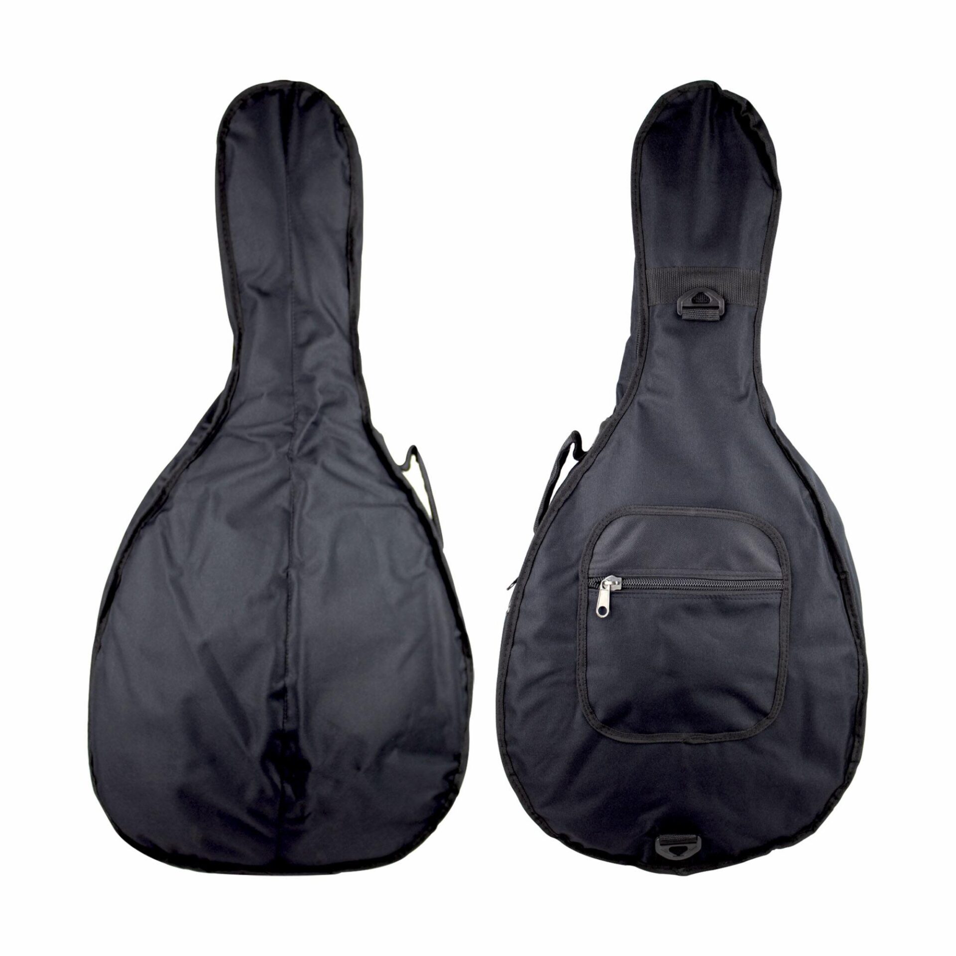 Exterior: Vihuela form. 33″ x 15″. 1.7 lbs. Black nylon over thick padding. Fastens with zipper. Accessory pocket with zipper. Side handle. D-rings for shoulder strap (included). Stitched piping.