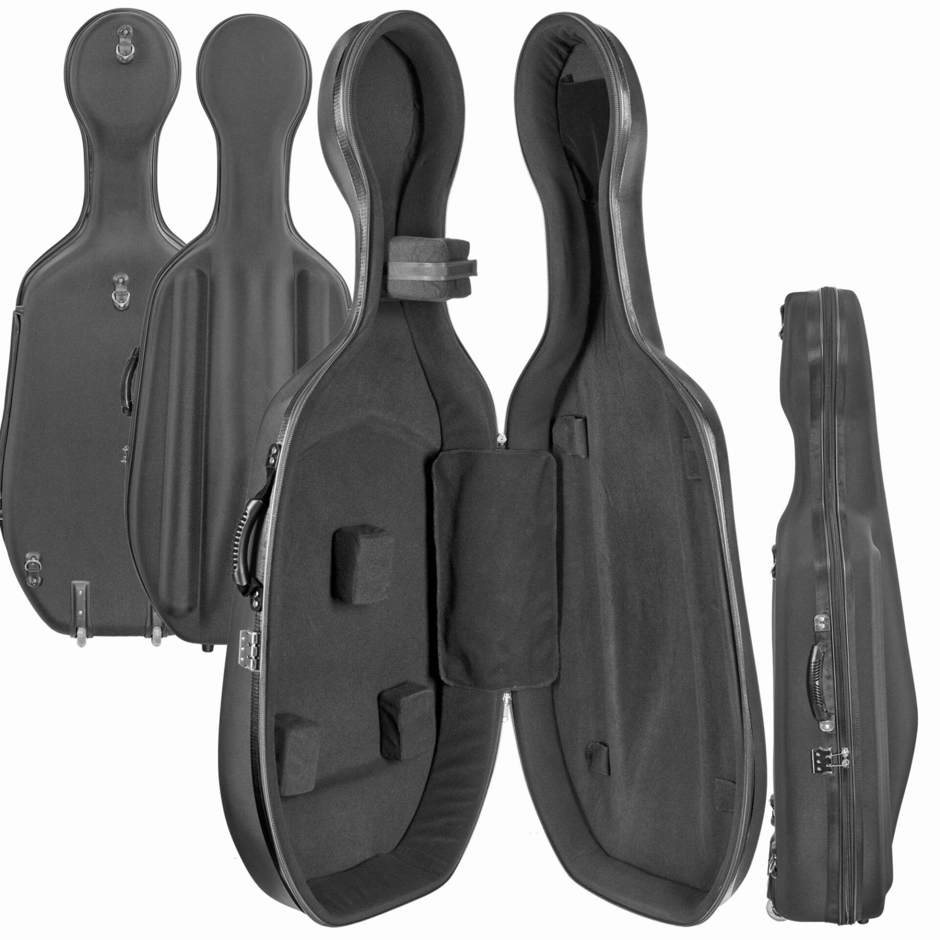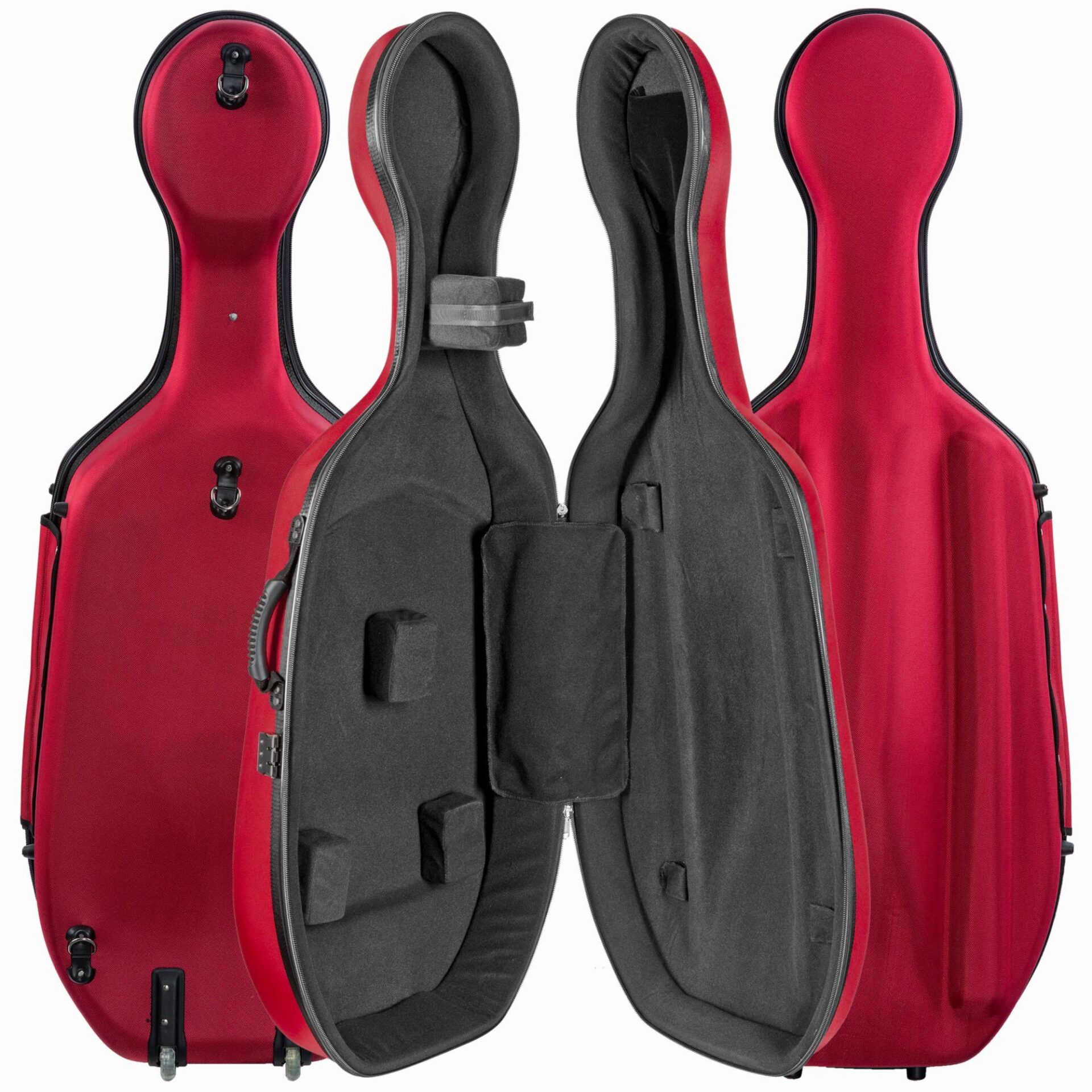 The CC490W is a semi rigid, lightweight case with wheels. It comes with a fabric exterior that is available in Red or Black. Two bow holders, accessory pocket, and backpack straps included.